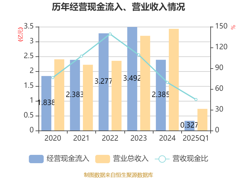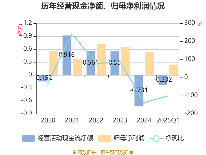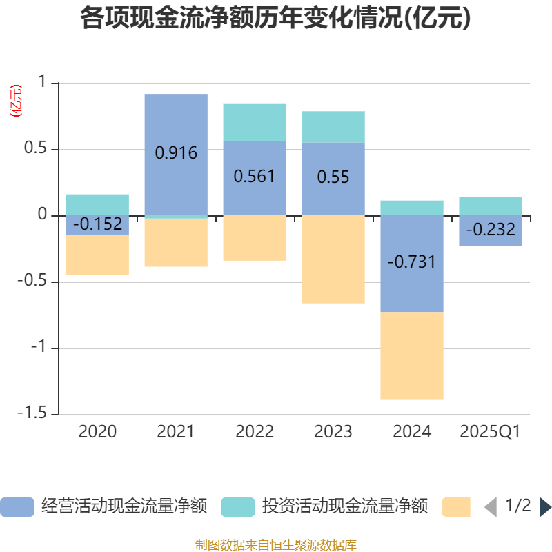 截至2025年一季度末,公司经营活动现金流净额为-2317.26万元,同比增加3189.83万元;筹资活动现金流净额0元,与同期相比基本不变;投资活动现金流净额1358.58万元赢赢顺配资,上年同期为1560万元。