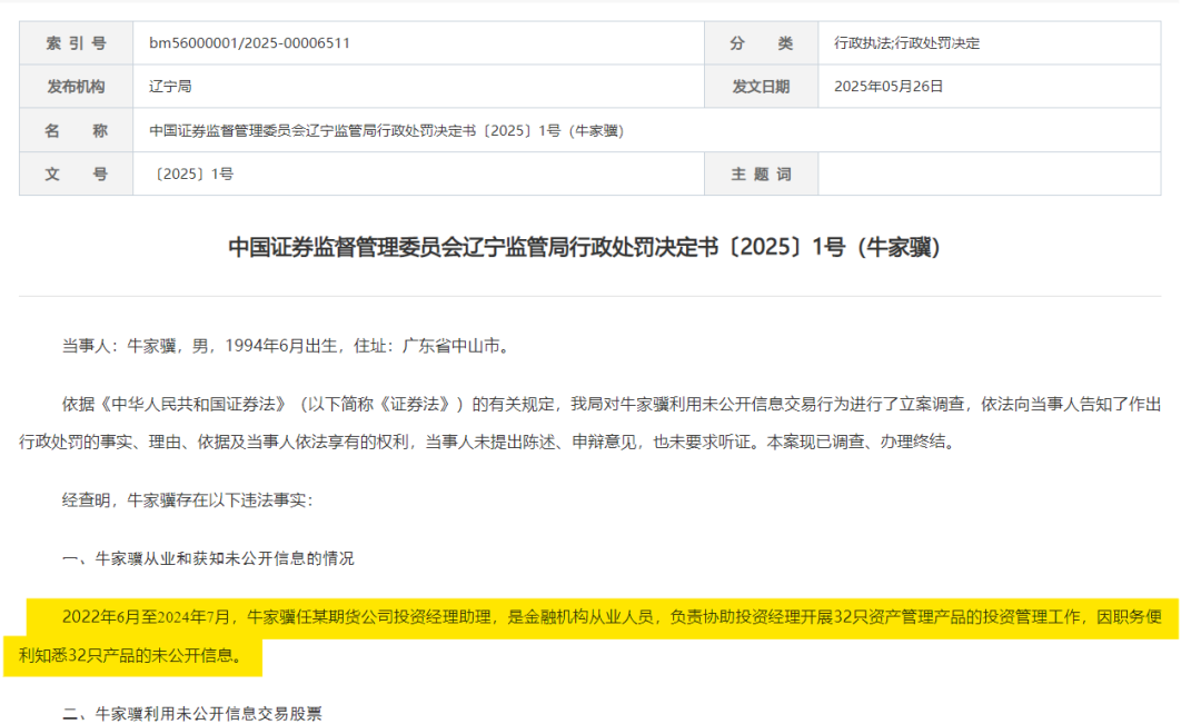 根据辽宁监管局行政处罚决定书,2022年6月至2024年7月,牛某骥任某期货公司投资经理助理,是金融机构从业人员锦达网,负责协助投资经理开展32只资产管理产品的投资管理工作,因职务便利知悉32只产品的未公开信息。