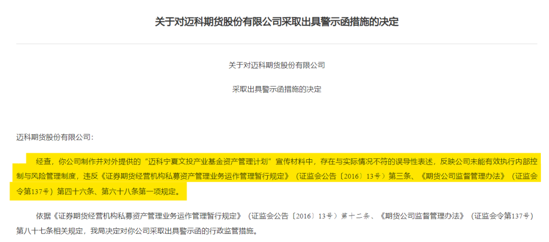 在针对迈科期货的罚单中,陕西证监局提到,迈科期货股份有限公司制作并对外提供的“迈科宁夏文投产业基金资产管理计划”宣传材料中,存在与实际情况不符的误导性表述,反映公司未能有效执行内部控制与风险管理制度,违反《证券期货经营机构私募资产管理业务运作管理暂行规定》(证监会公告〔2016〕13号)第三条,《期货公司监督管理办法》(证监会令第137号)第四十六条、第六十八条第一项规定。