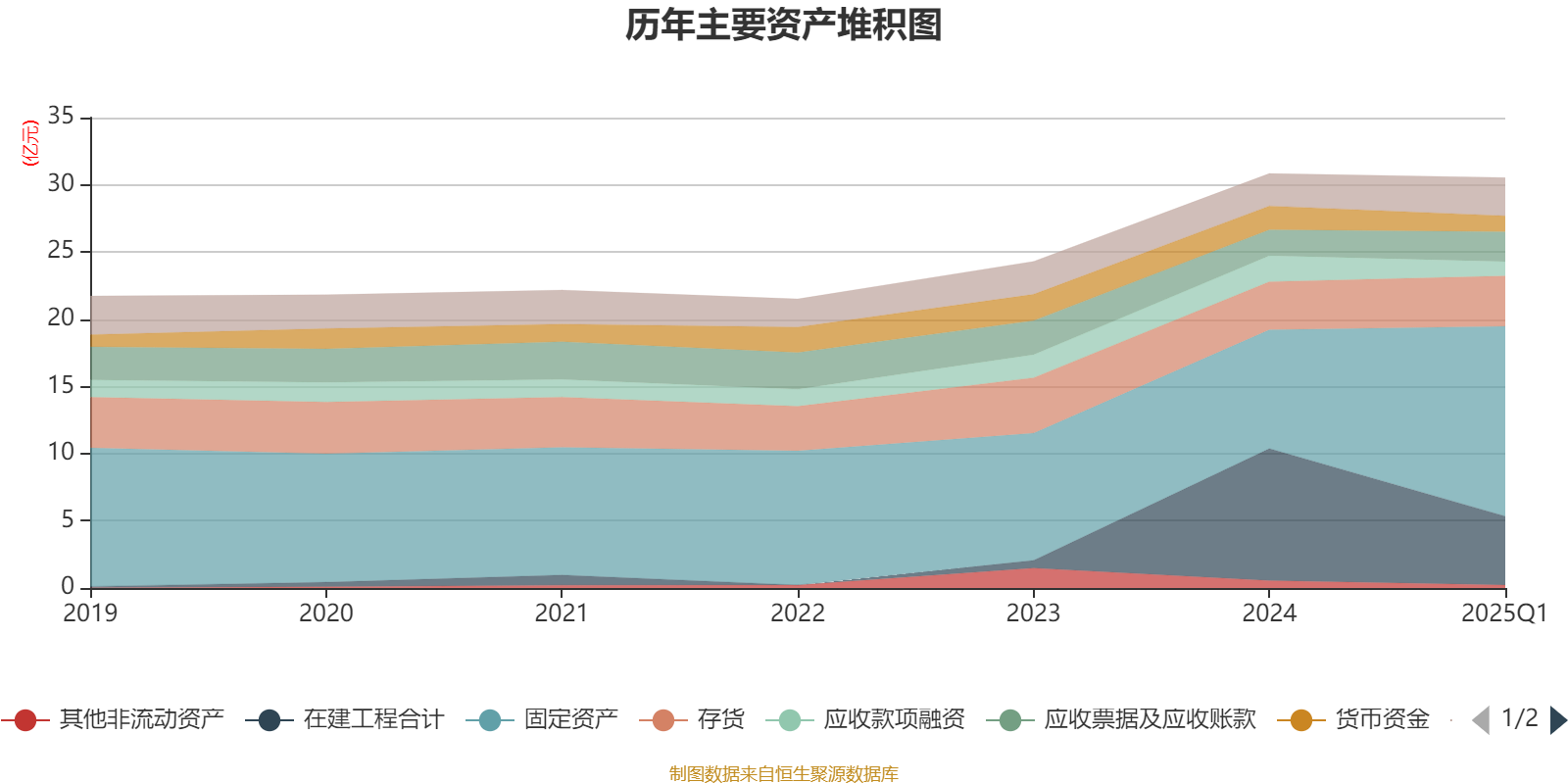 资产重大变化方面,截至2025年一季度末,公司固定资产较上年末增加59.99%,占公司总资产比重上升17.64个百分点;在建工程合计较上年末减少47.89%,占公司总资产比重下降15.09个百分点;应收款项融资较上年末减少44.81%,占公司总资产比重下降2.76个百分点;货币资金较上年末减少33.36%,占公司总资产比重下降1.88个百分点。