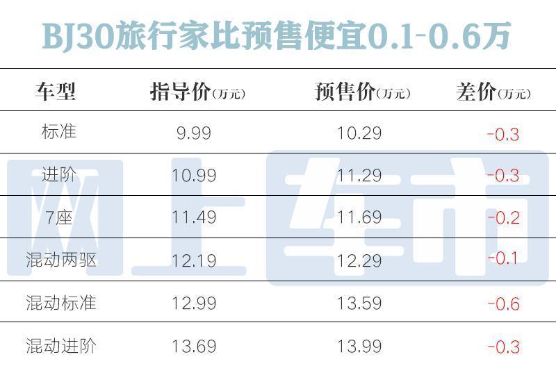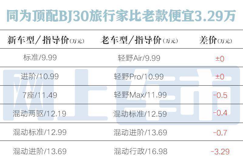 9月27日,北京越野宣布BJ30旅行家正式上市,官方指导价9.99万元起,旅行焕新价8.39万元起。全系指导价相比预售价便宜了1,000-6,000元不等,同为混动顶配,新款比老款便宜了3.29万元。BJ30旅行家增加燃油7座版金多多策略,二、三排均支持放倒。此外,其中控屏幕尺寸还升级至15.6英寸(老款14.6英寸)。