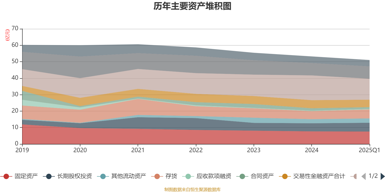 资产重大变化方面,截至2025年一季度末,公司应收票据及应收账款较上年末减少15.3%,占公司总资产比重下降3.3个百分点;存货较上年末增加12.4%,占公司总资产比重上升1.58个百分点;长期股权投资较上年末增加7.67%,占公司总资产比重上升1.14个百分点;合同资产较上年末减少26.27%,占公司总资产比重下降0.63个百分点。